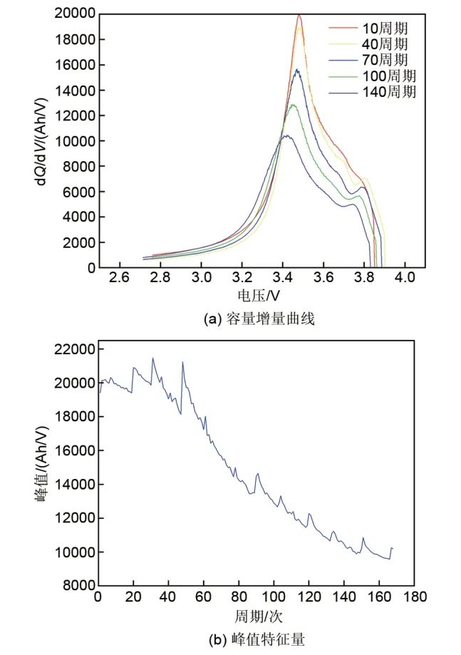 基于容量增量曲線是電池健康狀態(tài)估計(jì)方法之一。公式(1)為容量增量數(shù)值計(jì)算公式,其中Qt、Vt、Qt-1、Vt-1分別為在時(shí)間t或t-1下測(cè)量的容量值和電壓值。在每一次電池充放電周期,計(jì)算每個(gè)采樣周期內(nèi)的容量增量值,可構(gòu)建每次充放電周期的容量增量曲線,如圖1(a)所示。通過(guò)容量增量曲線,可提取峰值等特征量,表征電池的健康狀態(tài),如圖1(b)所示?;谔卣髁?,采用長(zhǎng)短期記憶神經(jīng)網(wǎng)絡(luò)等算法,構(gòu)建電池健康狀態(tài)估計(jì)模型。在工程應(yīng)用中,使用該估計(jì)模型,可估計(jì)電池健康狀態(tài)。