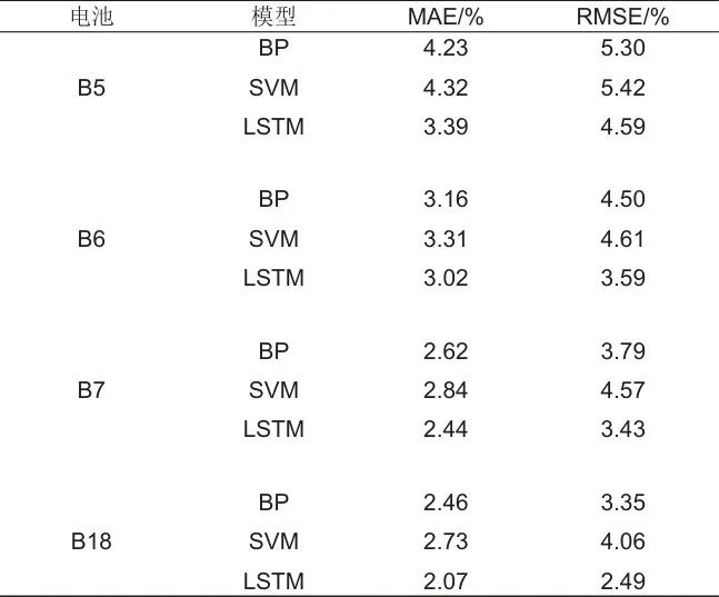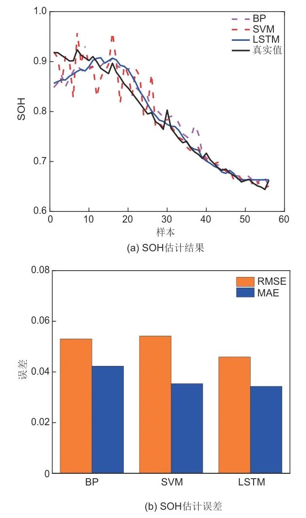 為了進(jìn)一步驗(yàn)證去噪后特征對(duì)LSTM模型的適應(yīng)性,還將所提的LSTM模型與BP神經(jīng)網(wǎng)絡(luò)模型、支持向量機(jī)(SVM)模型進(jìn)行SOH估計(jì)對(duì)比實(shí)驗(yàn)。圖17展示了在不同模型下,針對(duì)B5電池的SOH估計(jì)結(jié)果。從圖17(b)可以看出,LSTM模型的估計(jì)誤差最小,表明本工作提出的LSTM模型對(duì)去噪后的特征具有很好的適應(yīng)性。