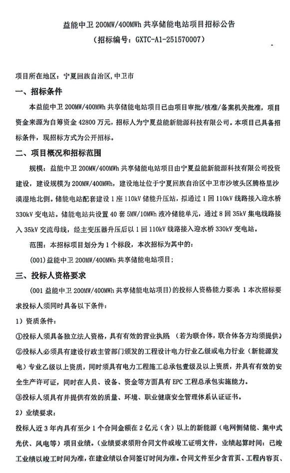 要求投標(biāo)人近3年內(nèi)具有至少1個(gè)合同金額在2億元(含)以上的新能源(電網(wǎng)側(cè)儲(chǔ)能、集中式光伏、風(fēng)電等)項(xiàng)目業(yè)績(jī)。