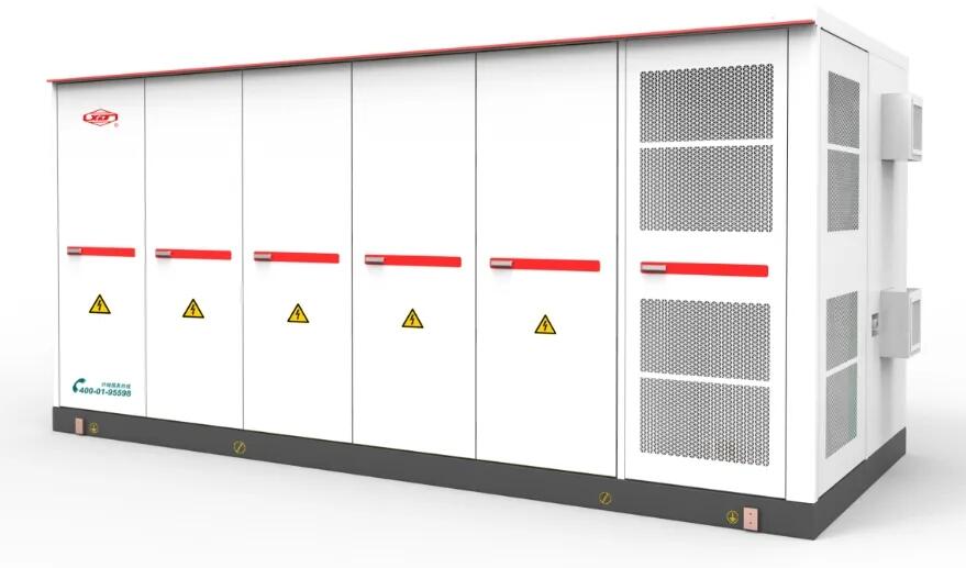 在項(xiàng)目推進(jìn)過程中,為節(jié)省儲(chǔ)能電站占地面積,采用了5MW/10MWh構(gòu)網(wǎng)儲(chǔ)能單元,交流側(cè)采用4機(jī)構(gòu)網(wǎng)儲(chǔ)能變流器并聯(lián)技術(shù),將4臺(tái)構(gòu)網(wǎng)儲(chǔ)能變流器集成于一套5MW構(gòu)網(wǎng)儲(chǔ)能升壓一體機(jī)中,較傳統(tǒng)構(gòu)網(wǎng)方案占地面積降低30%。