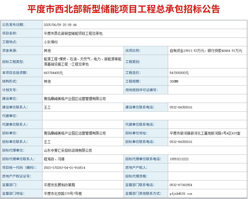 中國儲能網(wǎng)訊:6月9日,山東平度市西北部300MW/600MWh新型儲能項目工程總承包招標公告發(fā)布。工程造價547000000元,折合單價0.912元/Wh。