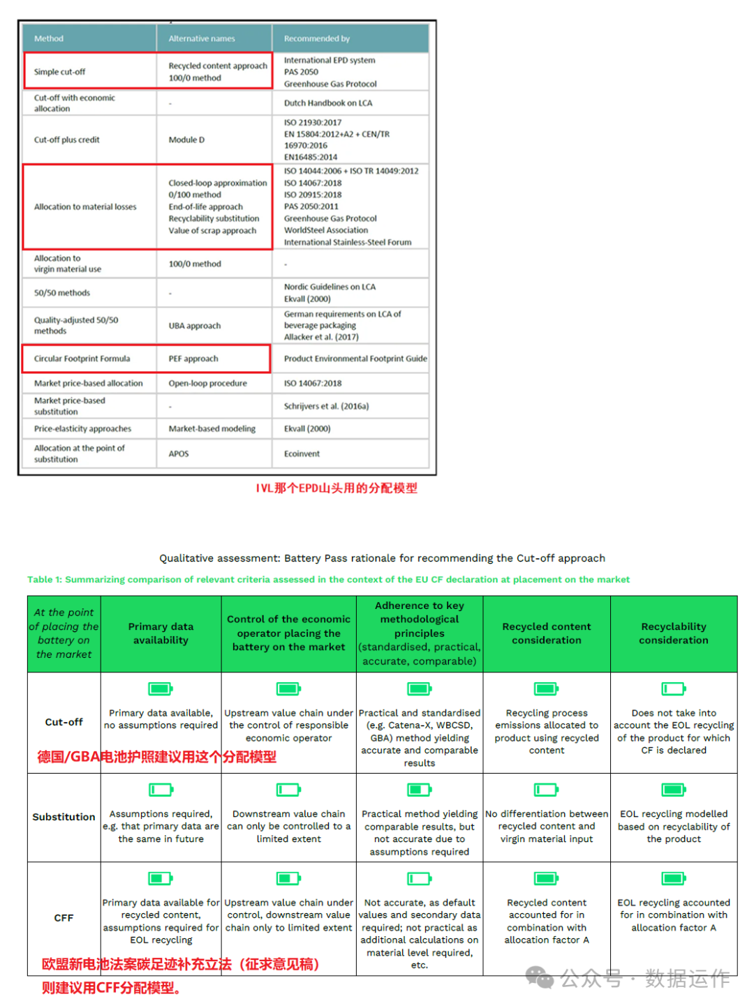 GBA電池護照的配套碳足跡核算指南Comparison of end-of-life allocation approaches討論了3種分配模型,分別是:Cut-off approach, Substitution approach和Circular Footprint Formula。最終建議使用Cut-off approach(而補充立法征求意見稿則使用CFF法)。