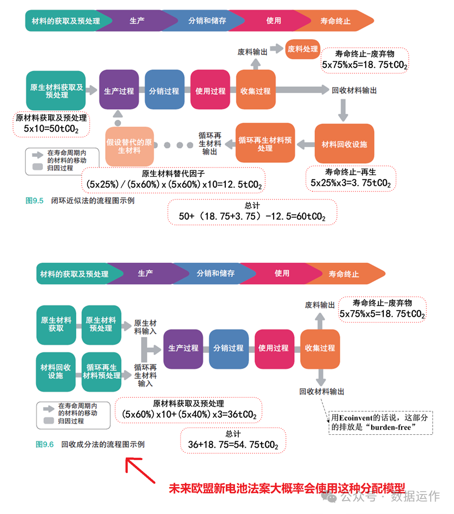 GBA電池護照的配套碳足跡核算規(guī)則對于資源循環(huán)利用情況下的分配模型(End-of-life and recycling rules)給出了詳細的解釋,并且專門發(fā)布了分配模型的指南。對于碳排放在不同產(chǎn)品之間的分攤,也給出了比ISO14044更詳細的原則(雖然在實踐中仍然可能出現(xiàn)問題)。