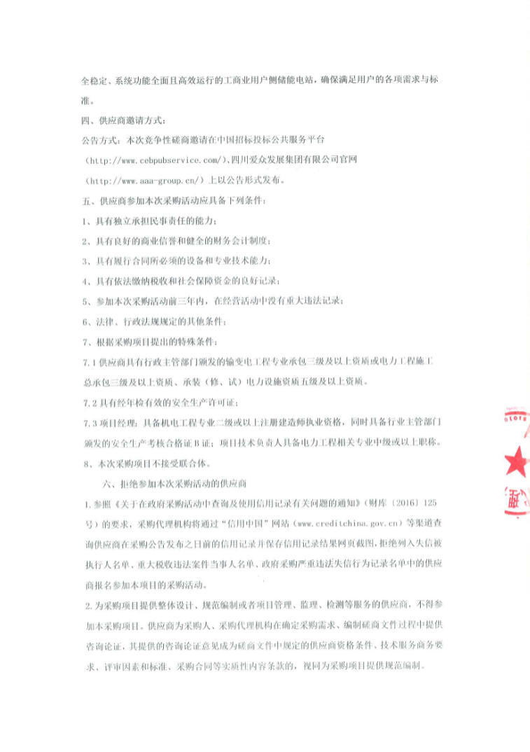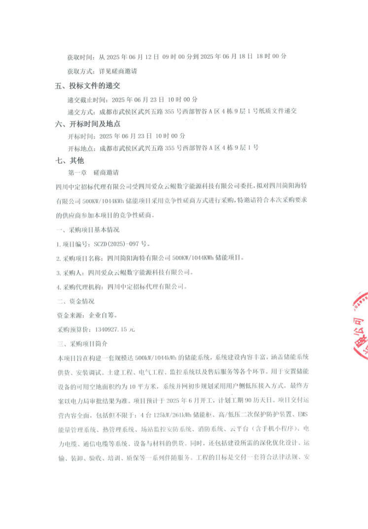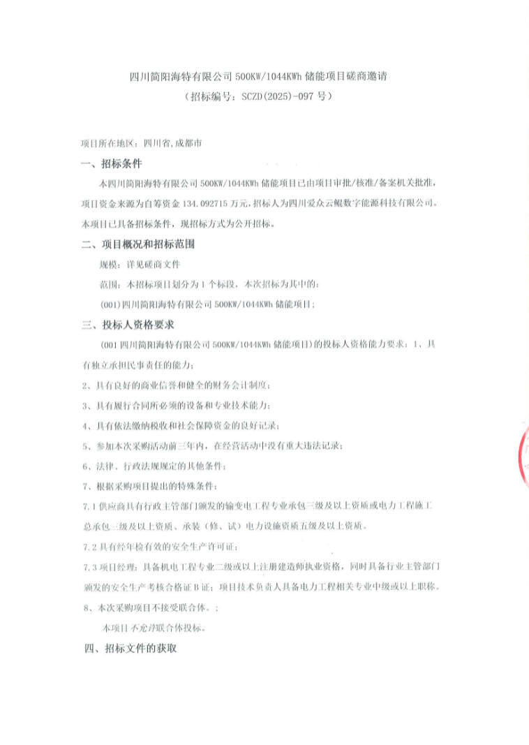 中國儲能網(wǎng)訊:6月11日,四川簡陽海特有限公司500KW/1044KWh儲能項目磋商邀請發(fā)布。