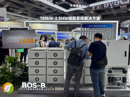 德業(yè)展出了多款新品,包含戶用光儲(chǔ)、工商業(yè)光儲(chǔ)、陽(yáng)臺(tái)(微型)光儲(chǔ)、光儲(chǔ)充一體化等領(lǐng)域,其中100kW-2.5MW模塊化工業(yè)級(jí)解決方案,由500kW STS搭配多臺(tái)100kW/125kW PCS模塊,匹配BOS-B系列215kWh儲(chǔ)能電池,還可以選配200kWp光伏模塊,實(shí)現(xiàn)對(duì)2.5MW以下工商業(yè)儲(chǔ)能系統(tǒng)功率、電池容量、光伏裝機(jī)量的靈活適應(yīng)。