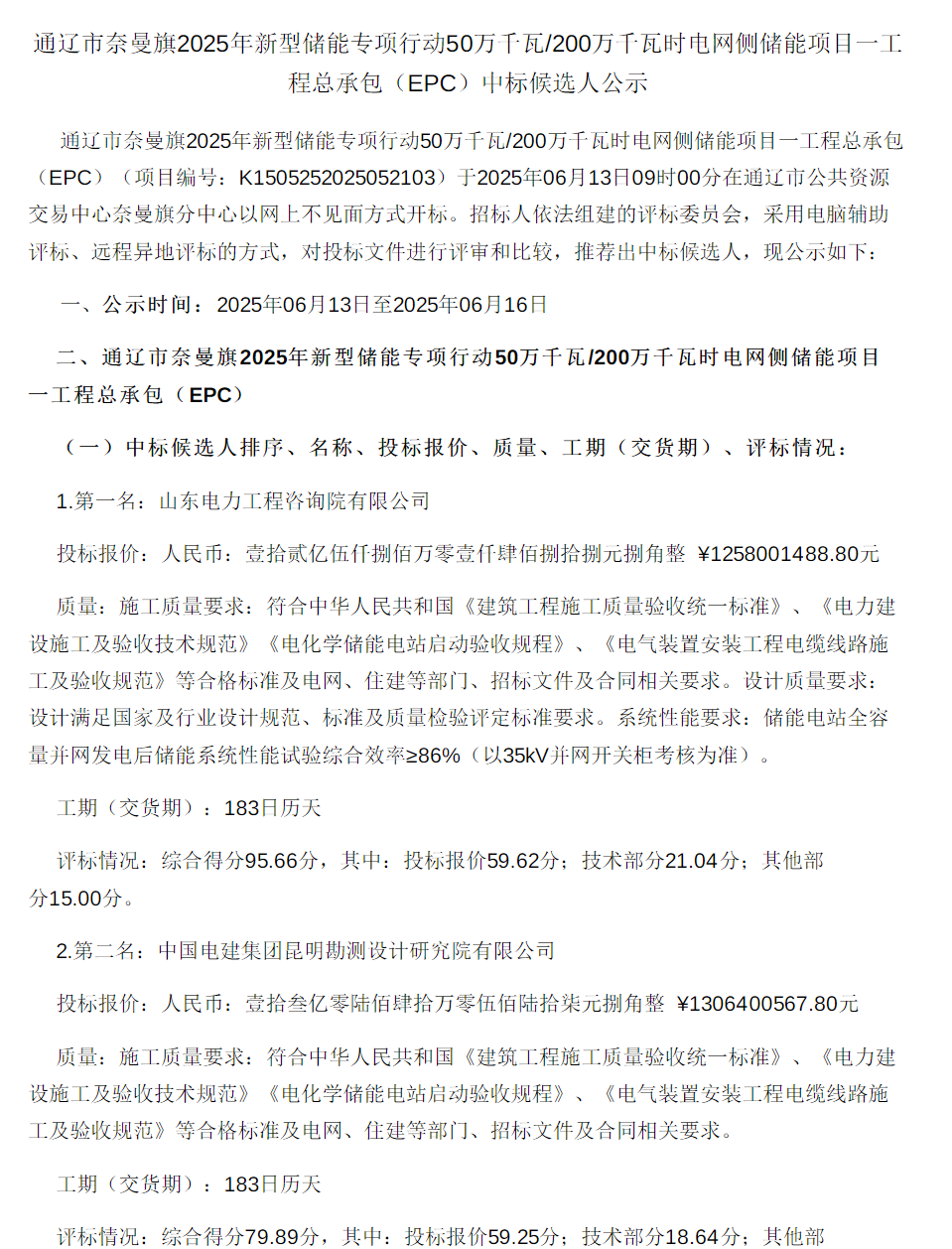 中標文件顯示,第一中標候選人為山東電力工程咨詢院有限公司,投標報價為1258001488.8元,折合單價為0.629元/Wh,綜合得分95.66分。