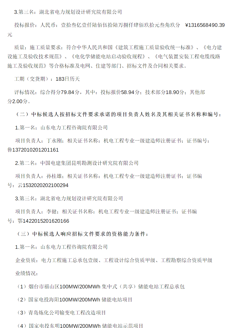 第三中標候選人為湖北省電力規(guī)劃設計研究院有限公司,投標報價為1316568490.39元,折合單價為0.6583元/Wh,綜合得分79.84分。