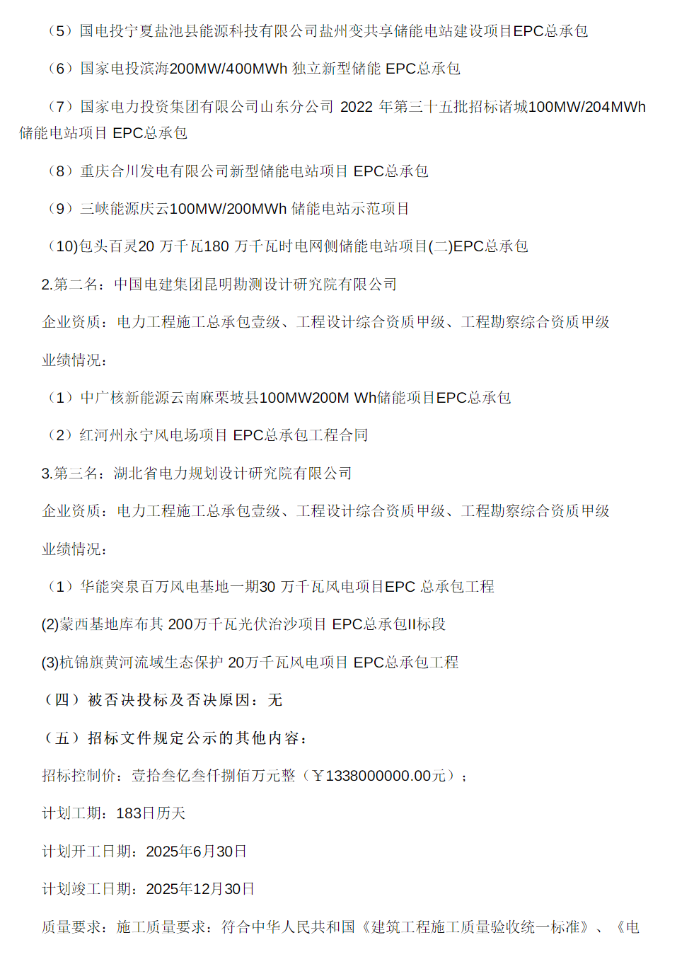第二中標候選人為中國電建集團昆明勘測設計研究院有限公司,投標報價為1306400567.8元,折合單價為0.6532元/Wh,綜合得分79.89分。