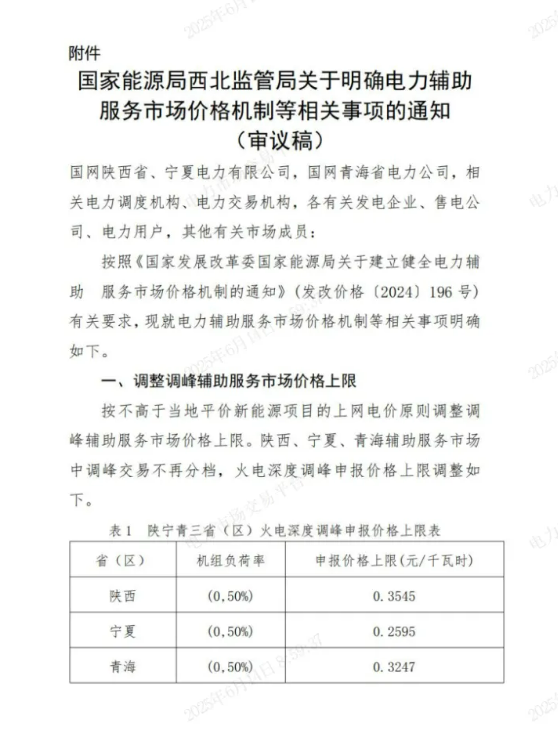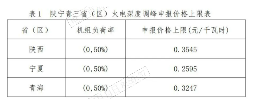 按不高于當(dāng)?shù)仄絻r(jià)新能源項(xiàng)目的上網(wǎng)電價(jià)原則調(diào)整調(diào)峰輔助服務(wù)市場(chǎng)價(jià)格上限。陜西、寧夏、青海輔助服務(wù)市場(chǎng)中調(diào)峰交易不再分檔,火電深度調(diào)峰申報(bào)價(jià)格上限調(diào)整如下: