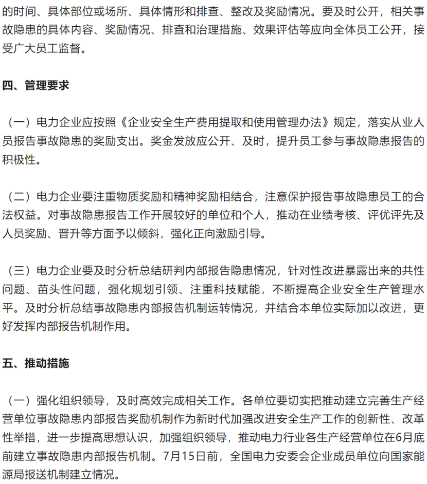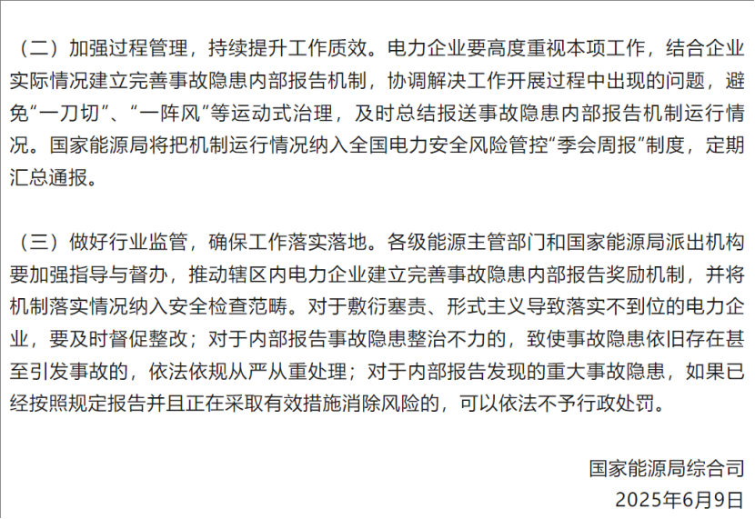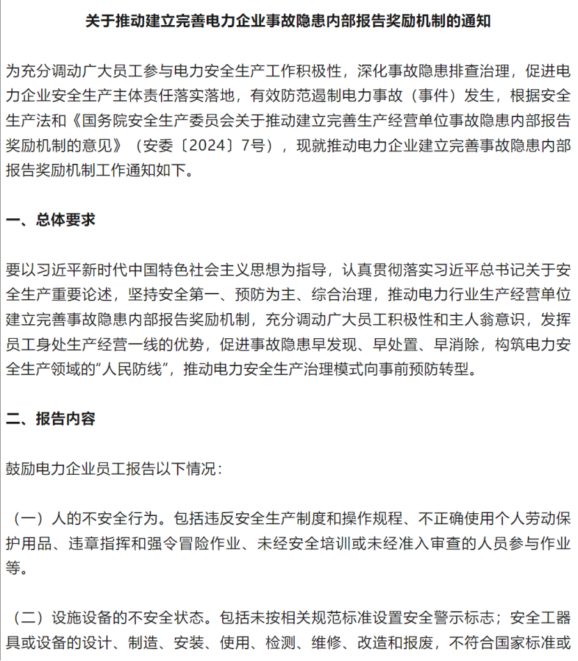 中國儲能網(wǎng)訊:當(dāng)新型儲能裝機(jī)規(guī)模即將沖破80吉瓦大關(guān),中國電力行業(yè)也站在了歷史性跨越的關(guān)口。國家能源局6月9日重磅落子的《關(guān)于推動建立完善電力企業(yè)事故隱患內(nèi)部報告獎勵機(jī)制的通知》,猶如在能源轉(zhuǎn)型的澎湃浪潮中筑起一道全員參與的安全堤壩。