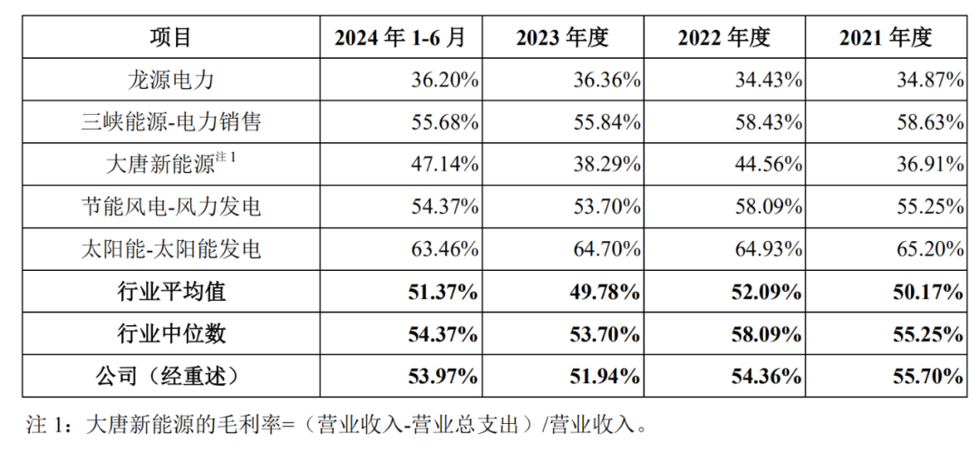 據(jù)招股書披露,華電新能源的主營業(yè)務(wù)毛利略高于同行業(yè)可比上市公司平均水平,2023年和2024年1-6月分別為51.94%和53.97%。