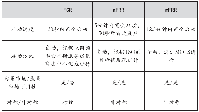 德國平衡市場的產品種類包括:頻率控制備用(The Frequency Containment Reserve,FCR),即一次調頻,保證系統頻率穩(wěn)定在額定頻率的±0.1赫茲內;自動頻率恢復備用(The automatic Frequency Restoration Reserve,aFRR),通常在FCR之后啟動,用于進一步糾正頻率偏差,主要通過自動頻率控制系統實現;手動頻率恢復備用(The manual Frequency Restoration Reserve,mFRR),是15分鐘內響應的備用服務。