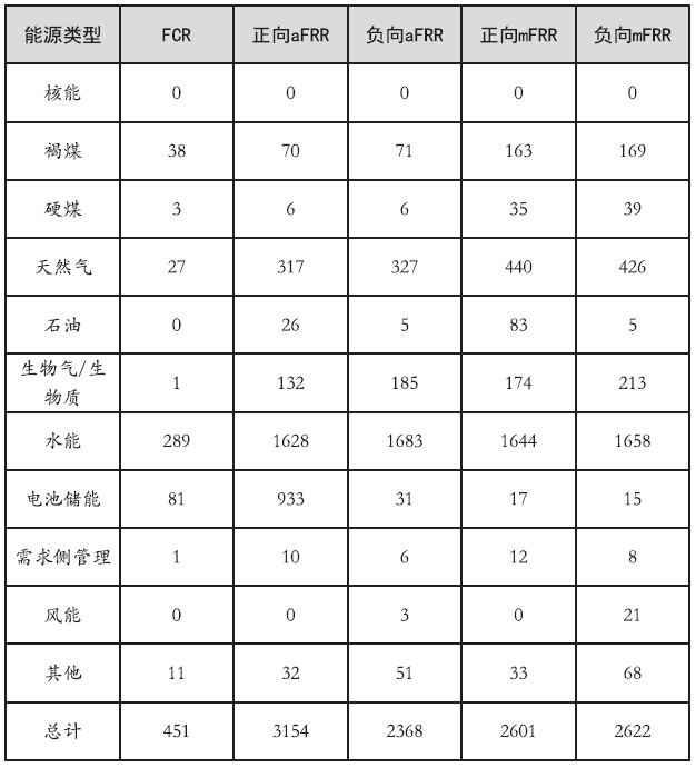 表2 德國不同平衡服務種類各類型資源預審核合格的容量統計2