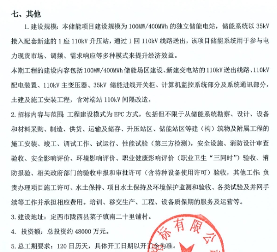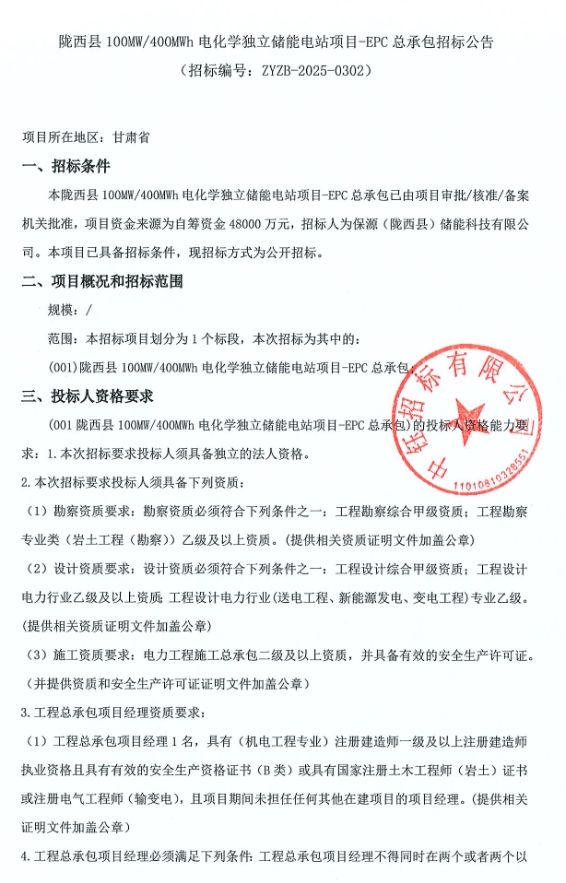 中國(guó)儲(chǔ)能網(wǎng)訊:6月19日,保源(隴西縣)儲(chǔ)能科技有限公司發(fā)布了隴西縣100MW/400MWh電化學(xué)獨(dú)立儲(chǔ)能電站項(xiàng)目-EPC總承包招標(biāo)公告項(xiàng)目,項(xiàng)目位于甘肅省定西市隴西縣。本儲(chǔ)能項(xiàng)目建設(shè)規(guī)模為100MW/400MWh的獨(dú)立儲(chǔ)能電站,儲(chǔ)能系統(tǒng)以 35kV接入配套新建的1座110kV升壓站,通過1回110kV線路送出,該項(xiàng)目?jī)?chǔ)能系統(tǒng)用于參與電力現(xiàn)貨市場(chǎng)、調(diào)頻、需求響應(yīng)等多種模式來提升經(jīng)濟(jì)效益。工程建設(shè)模式為EPC。