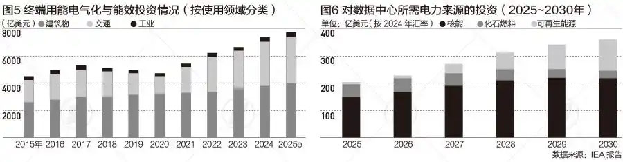 終端用能電氣化與能效投資在過去10年間近乎翻倍,2025年將達(dá)8000億美元。在交通領(lǐng)域,全球范圍內(nèi)電動汽車的銷售推動投資增長;在建筑領(lǐng)域,高效家電與制冷系統(tǒng)需求上升。工業(yè)領(lǐng)域電氣化與能效投資因政策支持與技術(shù)進(jìn)步持續(xù)增長,中國、歐盟、美國為主要市場。