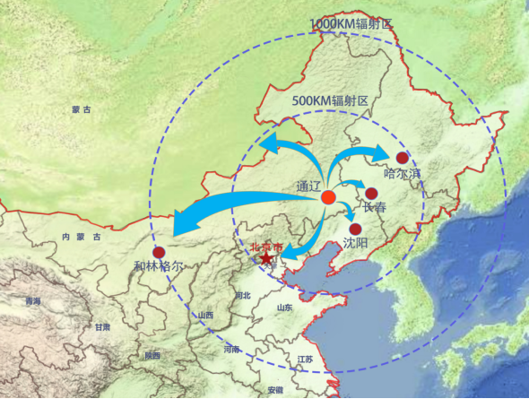 通遼市位于內(nèi)蒙古自治區(qū)東部,北部為大興安嶺南麓余脈的丘陵山地,南部為遼西山地邊緣的淺山丘陵,中部為西遼河沖積平原,平均海拔120~400米,總面積5.95萬平方公里,氣候?qū)僦袦貛Т箨懶约撅L(fēng)氣候,四季分明,年均氣溫0-6℃,年降水量350~400毫米,冬季受西伯利亞冷空氣影響更直接,低溫持續(xù)時間更長,有利于自然冷卻系統(tǒng)的穩(wěn)定運行。地處環(huán)渤海經(jīng)濟圈、東北經(jīng)濟區(qū)和東北亞三角經(jīng)濟區(qū),是東北與華北的交匯中心,東與吉林省接壤,南與遼寧省毗鄰,西與赤峰市、錫林郭勒盟交界,北與興安盟相連,其周邊800千米范圍內(nèi)有15個百萬人口以上城市,距離出??阱\州港僅400千米,距離沈陽市、長春市約300千米。通遼市是國家“一帶一路”倡議向北開放的重要戰(zhàn)略節(jié)點城市,也是內(nèi)蒙古距離港口最近的城市,近年來,積極參與共建“一帶一路”和中蒙俄經(jīng)濟走廊建設(shè),深化與沿邊口岸和沿海港口城市協(xié)作,推動保稅物流中心、多式聯(lián)運海關(guān)監(jiān)管中心等開放平臺提能增效,跨境電商交易規(guī)模持續(xù)攀升。
