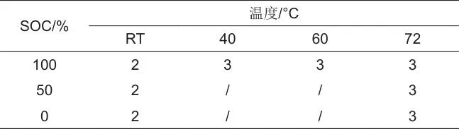 完成參考性能測(cè)試之后,調(diào)整電池荷電狀態(tài)至實(shí)驗(yàn)值(100% SOC、50% SOC、0 SOC)。本實(shí)驗(yàn)中采用ESPEC GPH 30高溫試驗(yàn)箱進(jìn)行環(huán)境溫度控制,溫度設(shè)定值分別為40 ℃、60 ℃、72 ℃,高溫儲(chǔ)存實(shí)驗(yàn)階段周期為5天(或其整數(shù)倍),每一周期結(jié)束后進(jìn)行一次參考性能測(cè)試;室溫(RT)對(duì)照組儲(chǔ)存實(shí)驗(yàn)階段周期為30天。