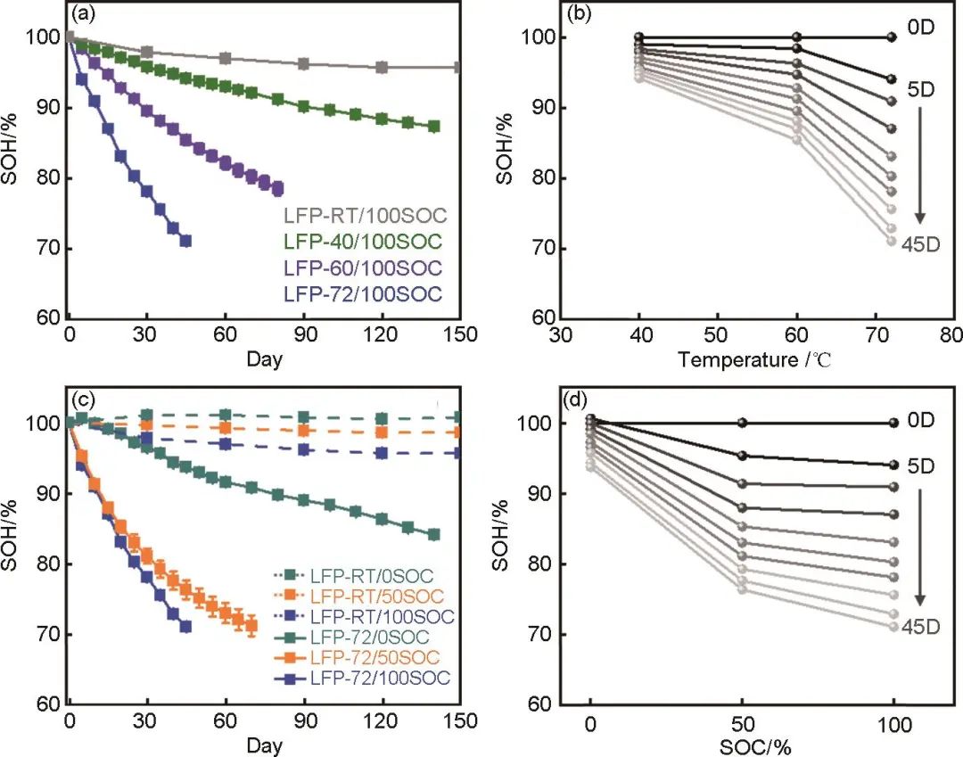 圖1 (a) 在滿電狀態(tài) (100% SOC) 下,不同溫度儲(chǔ)存的LFP電池SOH隨時(shí)間變化曲線,(b) 為相應(yīng)的SOH與環(huán)境溫度映射關(guān)系圖;(c) 室溫 (RT,虛線) 和72 ℃(實(shí)線) 時(shí),不同SOC儲(chǔ)存電池SOH隨時(shí)間變化曲線,(d) 為相應(yīng)的SOH與SOC映射關(guān)系圖