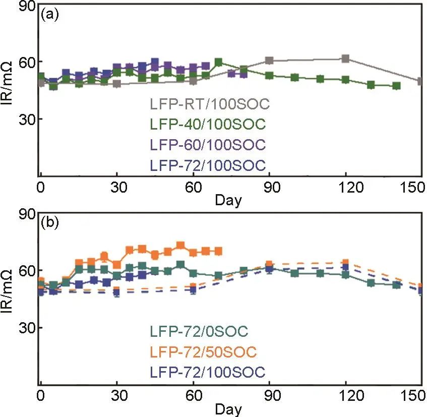 內(nèi)阻是鋰離子電池內(nèi)部鋰離子遷移動(dòng)力學(xué)過程阻力的直觀體現(xiàn),也是反映鋰離子電池性能變化的重要參量之一。在本研究中,雖然經(jīng)過儲(chǔ)存后磷酸鐵鋰電池的容量出現(xiàn)了明顯的衰退,但該型電池在50% SOC時(shí)的4C脈沖內(nèi)阻卻較為穩(wěn)定。如圖2所示,在整個(gè)實(shí)驗(yàn)周期內(nèi),大部分LFP電池內(nèi)阻呈現(xiàn)輕微波動(dòng)增加的趨勢(shì),僅LFP-72/50SOC電池樣品內(nèi)阻出現(xiàn)明顯增加。