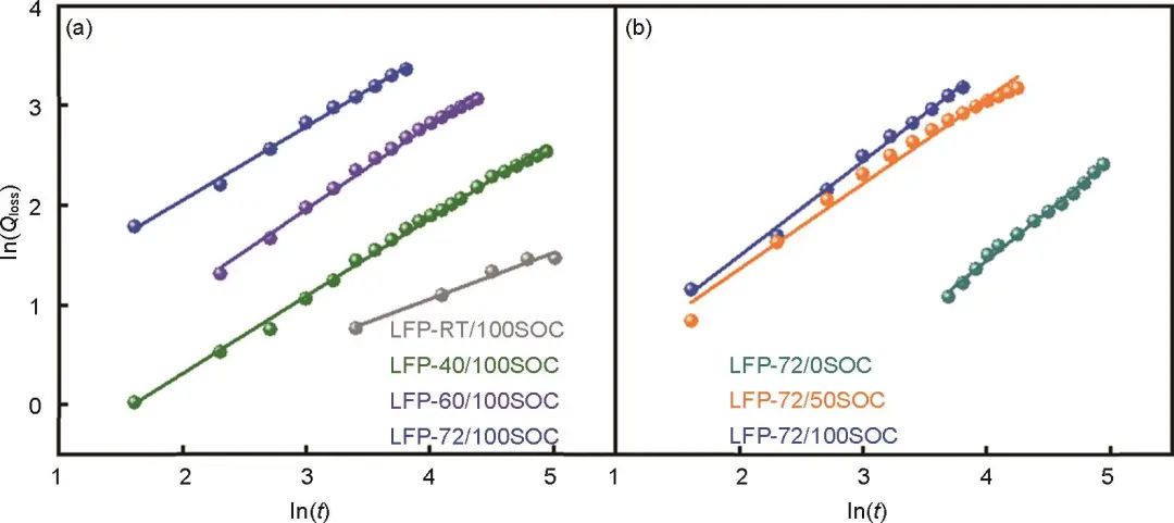 圖3 不同存儲(chǔ)條件下LFP電池容量損失 (Qloss) 與存儲(chǔ)時(shí)間 (t) 之間的對(duì)數(shù)擬合關(guān)系