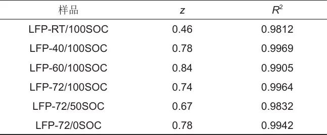 擬合結(jié)果如圖3所示,除室溫滿電存儲(chǔ)的樣品(LFP-RT/100SOC)外,其他磷酸鐵鋰電池樣品線性擬合曲線近似平行,即斜率z值近乎相同。表2擬合結(jié)果顯示,LFP-RT/100SOC電池樣品的z值為0.46(z≈0.5),這說明在室溫條件下,滿電LFP電池在存儲(chǔ)過程中其性能衰減可能主要是源于SEI膜的自然生長(zhǎng)過程,即石墨陽(yáng)極表面嵌鋰與電解液之間的副反應(yīng);而在其他工況條件下,z值均明顯大于0.5(0.67≤z≤0.84),這表明在這些工況下電池性能衰減機(jī)制可能更為復(fù)雜。