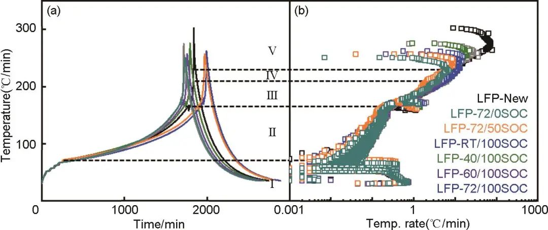 進(jìn)一步對(duì)磷酸鐵鋰電池單體的熱安全性進(jìn)行了研究,在絕熱環(huán)境中通過設(shè)備加熱來引發(fā)電池自發(fā)熱并最終觸發(fā)電池?zé)崾Э亍=Y(jié)果如圖5所示,新鮮電池樣品LFP-New的熱失控反應(yīng)表現(xiàn)最為劇烈,其熱失控最高溫度TMAX最大,達(dá)302.6 ℃,熱失控最大溫升速率(dT/dt)MAX最高,達(dá)79 ℃/min;然而,經(jīng)過不同條件存儲(chǔ)之后,該型磷酸鐵鋰電池的熱安全性均有不同程度的提升,體現(xiàn)在其主要熱失控特性參數(shù)TMAX和(dT/dt)MAX均有所下降。圖5(b)顯示磷酸鐵鋰電池?zé)崾Э販厣俾蔬^程表現(xiàn)出明顯的分階段特征,本工作中將電池?zé)崾Э貏澐譃?個(gè)階段,其中:階段I為“加熱-等待-搜尋”階段,此過程中儀器腔內(nèi)溫度呈階梯式上升,為電池提供熱量;階段II為電池自加熱階段(自加熱至泄壓閥打開);階段III為電池快速自加熱階段;階段IV為電池?zé)崾Э仉A段;階段V為熱失控結(jié)束降溫階段。