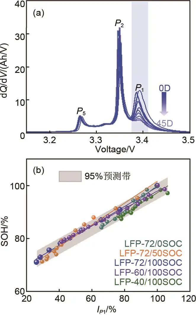 圖8 (a) LFP-72/100SOC樣品的容量增量曲線;(b) LFP電池健康狀態(tài)SOH與特征峰強(qiáng)IP1關(guān)系圖