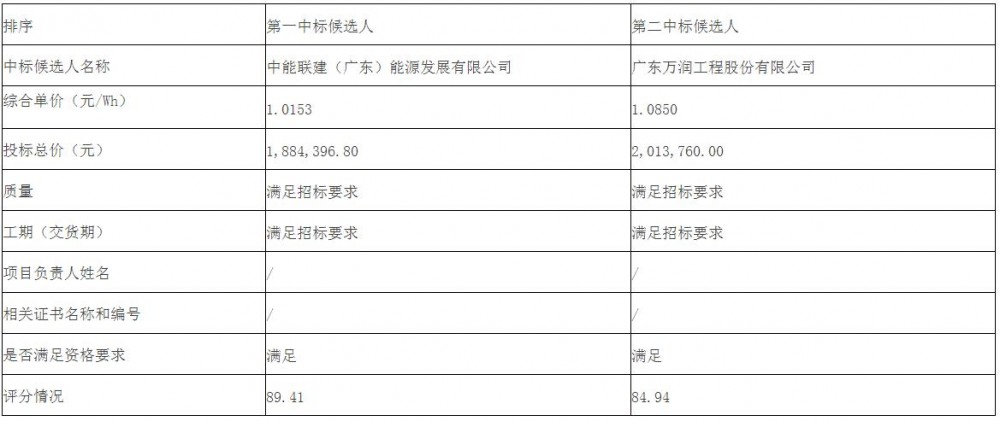 第一中標(biāo)候選人為中能聯(lián)建(廣東)能源發(fā)展有限公司,投標(biāo)報(bào)價(jià)1884396.8元,折合單價(jià)1.0153元/Wh;第二中標(biāo)候選人為廣東萬潤工程股份有限公司,投標(biāo)報(bào)價(jià)2013760元,折合單價(jià)1.085元/Wh。