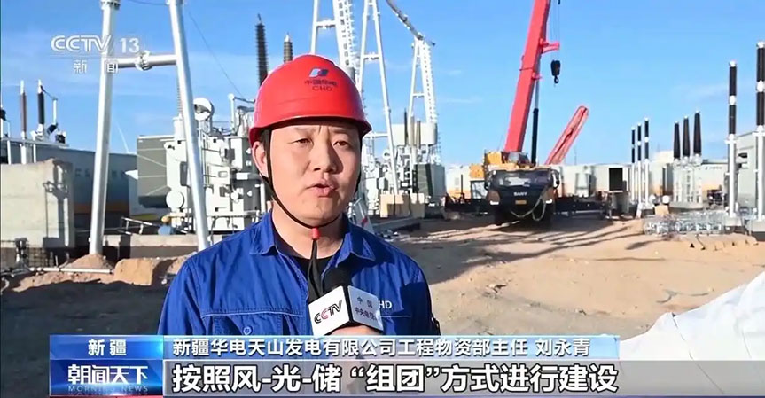 新疆華電天山發(fā)電有限公司工程物資部主任 劉永青:項目采用風(fēng)光同場布置,按風(fēng)-光-儲“組團(tuán)”方式建設(shè),同步建設(shè)8座220KV匯集站,是國內(nèi)首個“風(fēng)光火儲”一體化運(yùn)行控制新能源項目。