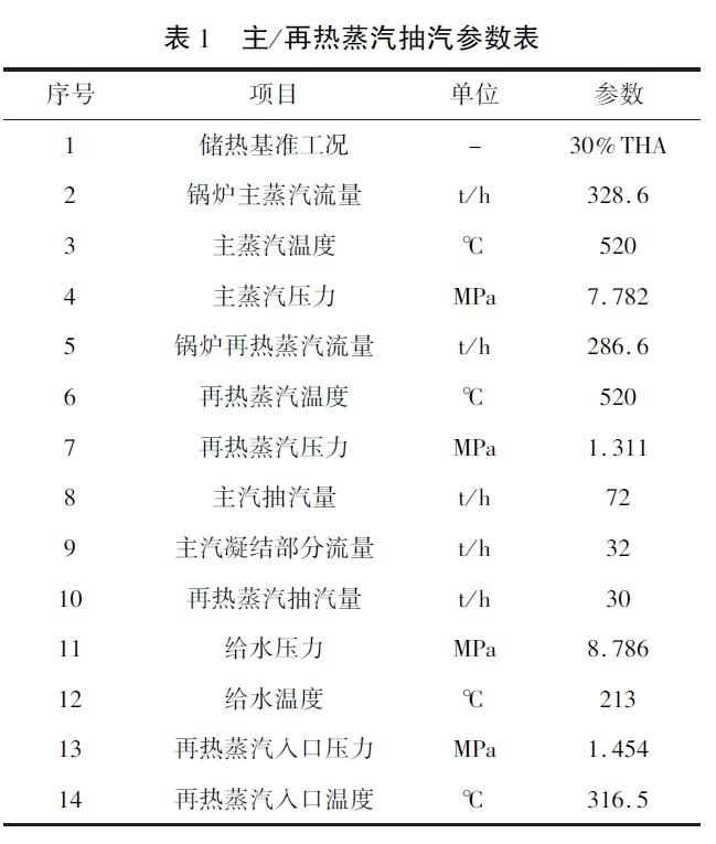 為滿足電廠20%THA的深調(diào)需求,考慮為原機組配備一套熔鹽儲熱系統(tǒng),深調(diào)階段熔鹽儲熱投運的基準工況對應(yīng)為機組30%THA負荷,鍋爐側(cè)能夠保持30%THA負荷穩(wěn)定運行,汽輪發(fā)電機側(cè)運行負荷深調(diào)至20%THA。