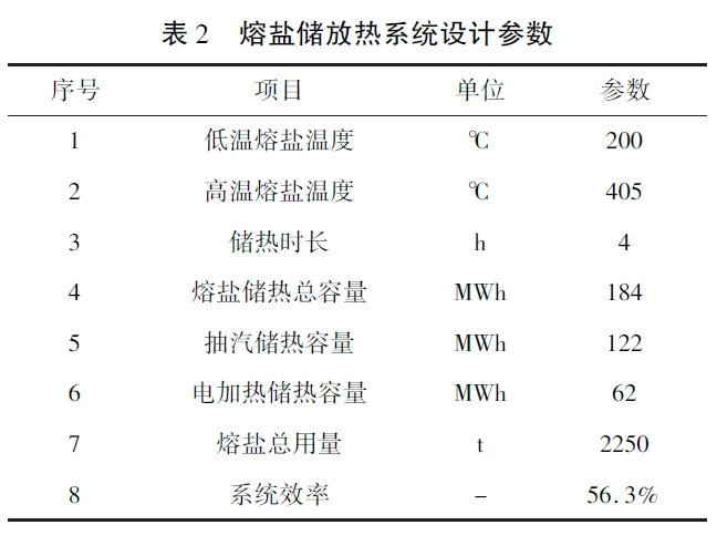 通過系統(tǒng)熱平衡計算,本熔鹽儲熱系統(tǒng)總儲熱容量為184MWh,Hitec三元熔鹽總用量為2250t,其中通過抽汽加熱熔鹽的儲熱容量為122MWh,電加熱熔鹽部分的儲熱容量62MWh。