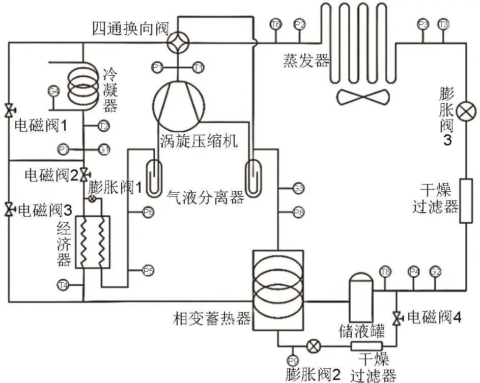 圖1 經(jīng)濟(jì)器耦合相變蓄熱器的空氣源熱泵系統(tǒng)原理圖
