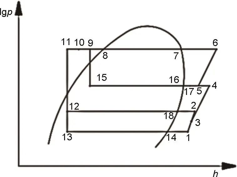 圖2 經(jīng)濟(jì)器耦合相變蓄熱器的空氣源熱泵系統(tǒng)壓焓圖