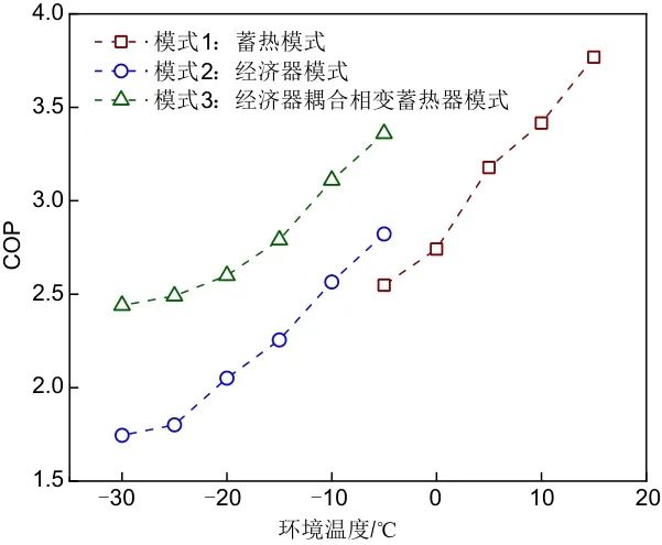 (2)在環(huán)境溫度為-5 ℃~-30 ℃時(shí),模式3利用蓄熱器作為系統(tǒng)的輔助熱源提供額外熱量。即使在-30 ℃的極低環(huán)境溫度下COP依然可達(dá)2.44,與模式2相比,模式3的COP提高了19.06%~39.9%,制熱量增加了21.54%~43.46%,排氣溫度降低了4.55~12.78 ℃,制冷劑的流量增加了11.8%~48.7%。