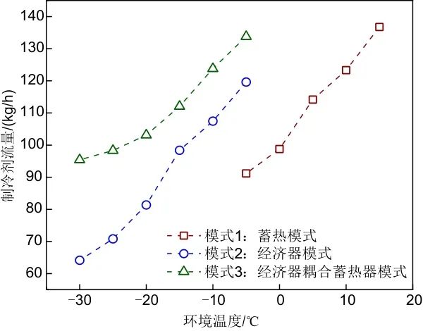 圖7 不同運(yùn)行模式下制冷劑流量隨環(huán)境溫度的變化