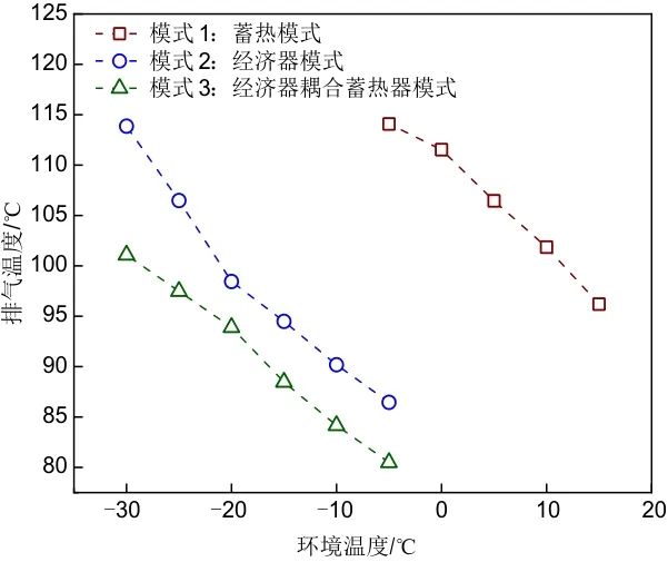 圖9展示了在不同環(huán)境溫度下壓縮機(jī)排氣溫度的變化。由圖可知,隨著環(huán)境溫度的降低,壓縮機(jī)的排氣溫度呈現(xiàn)上升的趨勢(shì)。在-5 ℃工況下,模式2與模式3排氣溫度大幅降低,同時(shí),當(dāng)環(huán)境溫度為-30 ℃時(shí),模式2的排氣溫度為113.86 ℃,而模式3的排氣溫度僅為101.08 ℃,顯著低于模式2。這一差異主要是受到制冷劑流量和壓比的影響,在輸入功一定的條件下,制冷劑流量越大,單位制冷劑的溫升則越小,導(dǎo)致排氣溫度降低。此外由于蓄熱器處制冷劑蒸發(fā)壓力較高,吸氣壓力也隨之提高,從而降低了壓縮機(jī)的壓比,進(jìn)而降低了排氣溫度。