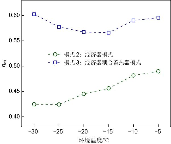 (3)制冷劑的流量隨著環(huán)境溫度的降低而減小,造成?損的增加以及?效率的降低。在模式3中,蓄熱器的加入保證了制熱能力和制熱效率的穩(wěn)定性和可靠性,?效率可提升21.6%~41.8%。