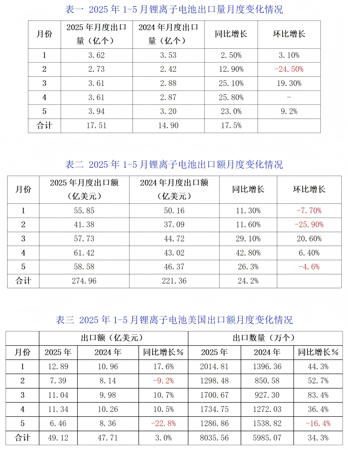 中國(guó)儲(chǔ)能網(wǎng)訊:根據(jù)海關(guān)最新統(tǒng)計(jì)數(shù)據(jù),2025年1-5月鋰離子電池出口數(shù)量為17.51億個(gè),同比增長(zhǎng)17.5%;2025年1-5月我國(guó)鋰離子電池出口額為274.96億美元,同比增加24.2%,延續(xù)了穩(wěn)定增長(zhǎng)勢(shì)頭。其中,2025年5月份,出口額58.58億美元,環(huán)比下降4.6%,5月份,出口數(shù)量為3.94億個(gè),環(huán)比增長(zhǎng)9.2%。出口總體呈現(xiàn)量增價(jià)跌趨勢(shì)。