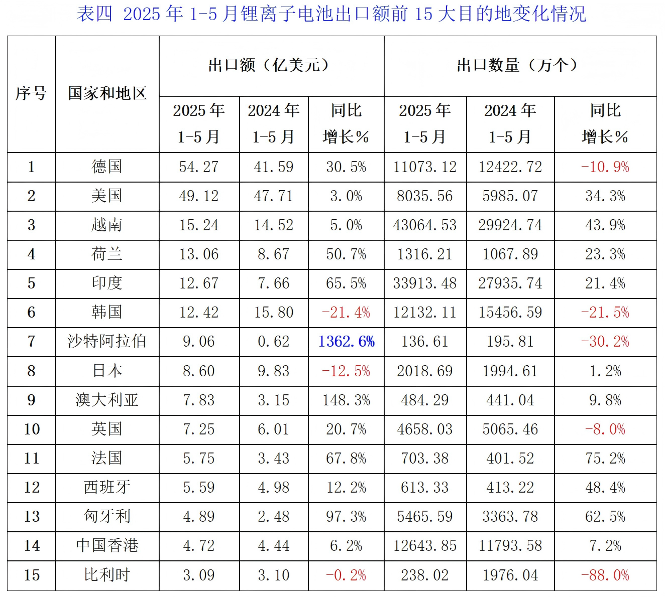 今年以來(lái),德國(guó)首次超越美國(guó)成為我國(guó)鋰離子電池第一大出口市場(chǎng),2025年1-5月出口金額為54.27億美元,同比增長(zhǎng)30.49%,占我國(guó)鋰離子出口總額的19.7%。這一變化源于德國(guó)車(chē)企電動(dòng)化轉(zhuǎn)型的加速。大眾ID.7、寶馬Neue Klasse等主力電動(dòng)車(chē)型的量產(chǎn),推動(dòng)了對(duì)中國(guó)高端動(dòng)力電池的采購(gòu)需求。僅2025年第一季度,中國(guó)對(duì)德動(dòng)力電池出口就占到整個(gè)歐洲市場(chǎng)的52%。