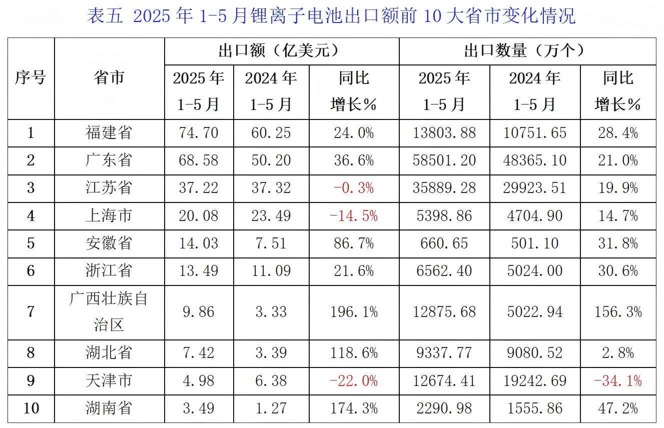 2025年1-5月福建省仍是我國(guó)鋰離子電池出口產(chǎn)品的最大來(lái)源地,出口金額為74.7億美元,同比增長(zhǎng)24%,占我國(guó)鋰離子電池出口額的27.2%;出口數(shù)量為1.38億個(gè),同比增長(zhǎng)28.4%。廣東省位居第二,出口金額為68.58億美元,同比增加36.6%,占我國(guó)鋰離子電池出口額的24.9%;出口數(shù)量5.85億個(gè),同比增長(zhǎng)21.0%。江蘇省排名第三,出口額為37.22億美元,同比降低0.3%,占我國(guó)鋰離子電池出口額的13.5%;出口數(shù)量3.59億個(gè),同比增長(zhǎng)19.9%。福建、廣東和江蘇三省的鋰離子電池出口額占到全國(guó)鋰離子電池出口額的65.6%。
