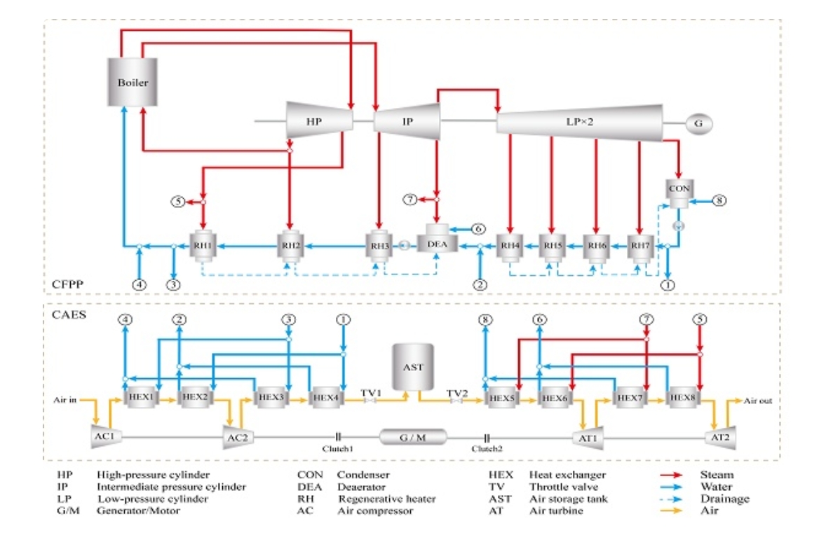在新型電力系統(tǒng)轉(zhuǎn)型背景下,燃煤電廠作為重要的調(diào)節(jié)性資源,面臨著更高的調(diào)峰深度要求,以及低負(fù)荷運(yùn)行時(shí)易發(fā)生脫硝系統(tǒng)失效、系統(tǒng)能耗增加等行業(yè)亟待解決的重要問(wèn)題。本研究開(kāi)發(fā)了一套適用于新一代煤電的物理儲(chǔ)能耦合系統(tǒng),創(chuàng)新性地將物理儲(chǔ)能余熱應(yīng)用到提升脫硝系統(tǒng)工作溫度的場(chǎng)景中,通過(guò)雙級(jí)壓縮和膨脹工藝優(yōu)化實(shí)現(xiàn)高效能量轉(zhuǎn)化。同時(shí),該技術(shù)有效解決了物理儲(chǔ)能系統(tǒng)充放電過(guò)程熱利用平衡問(wèn)題和燃煤電廠低負(fù)荷下運(yùn)行脫硝系統(tǒng)低溫失效問(wèn)題,耦合系統(tǒng)的儲(chǔ)能循環(huán)往返效率高達(dá)85.1%,相較于獨(dú)立運(yùn)行物理儲(chǔ)能系統(tǒng)效率提升了13.5%,度電成本降低了23%,顯著提高了鍋爐脫硝系統(tǒng)在低負(fù)荷下的工作溫度和運(yùn)行可靠性。