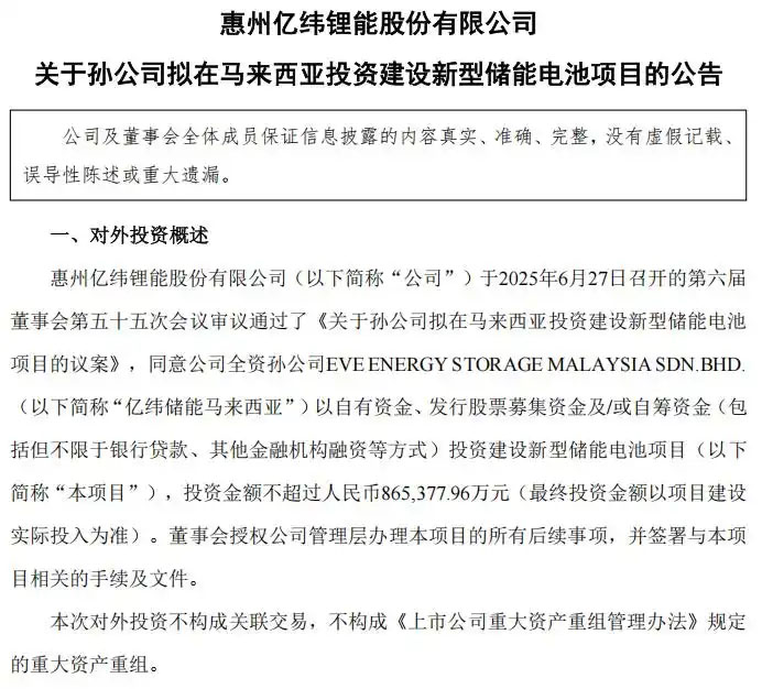 6月27日晚間,億緯鋰能(證券代碼:300014)發(fā)布公告稱,公司全資孫公司億緯儲能馬來西亞(EVE ENERGY STORAGE MALAYSIA SDN.BHD.)將在馬來西亞吉打州投資建設(shè)新型儲能電池項目,投資總額不超過86.54億元,旨在通過海外產(chǎn)能布局深化全球化戰(zhàn)略,應(yīng)對全球儲能市場需求增長及國際貿(mào)易環(huán)境變化。