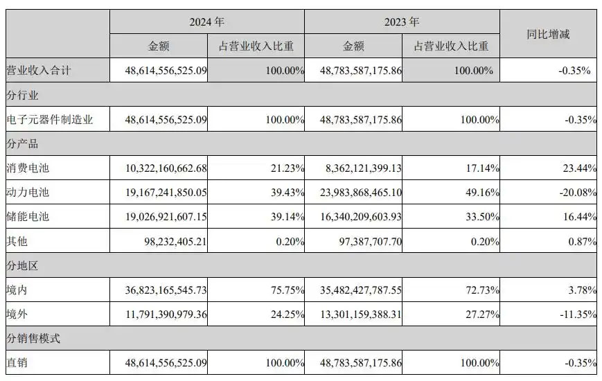 財報顯示,2024年億緯鋰能實現(xiàn)營業(yè)收入486.15億元,同比微降0.35%;實現(xiàn)凈利潤40.76億元,同比增長0.63%。其中,儲能電池營業(yè)收入為190.3億元,僅次于動力電池,同比增長16.44%,表現(xiàn)搶眼。