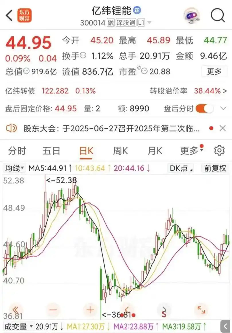 截至6月27日,億緯鋰能股價收于44.95元/股,總市值達919.6億元。