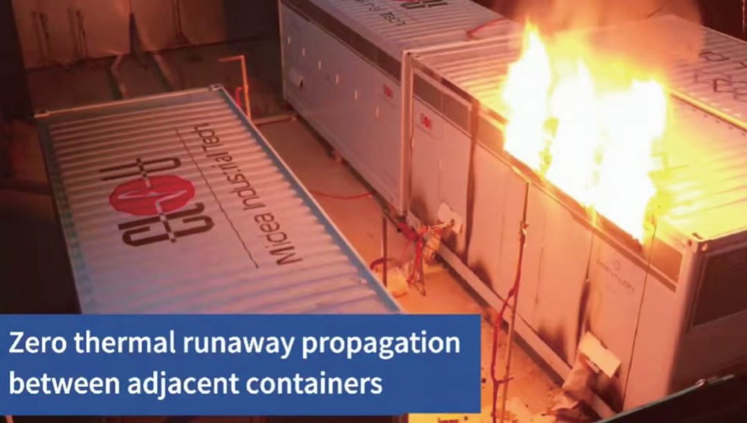 6月5日,海辰儲(chǔ)能公布其∞Block 5MWh儲(chǔ)能系統(tǒng)已成功完成全球首次開(kāi)門(mén)燃燒試驗(yàn)。圍繞“開(kāi)門(mén)燃燒+雙15cm極限間距+主動(dòng)消防關(guān)閉+100%SOC滿電狀態(tài)” 四大極限條件展開(kāi)。測(cè)試結(jié)果顯示,所有相鄰集裝箱內(nèi)的電芯溫度均遠(yuǎn)低于UL9540A電芯層級(jí)測(cè)試測(cè)定設(shè)定的電芯熱失控觸發(fā)閾值溫度。觸發(fā)預(yù)制艙未發(fā)生結(jié)構(gòu)變形或坍塌,相鄰三個(gè)20尺集裝箱箱體均未發(fā)生燃燒和熱失控傳播。