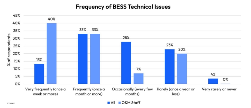 該調(diào)查發(fā)現(xiàn),“73%的運維人員每月至少遇到一次技術(shù)問題,而電池儲能系統(tǒng)的資產(chǎn)管理人員只有53%。此外,40%的運維人員報告每周都會遇到問題,這一比例是資產(chǎn)管理人員的兩倍?!?/strong>