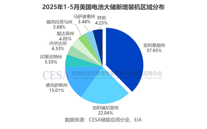 2025年1-5月,亞利桑那、加利福尼亞、德克薩斯和印第安納等州新增裝機均超過1GWh。其中,亞利桑那州新增裝機領(lǐng)跑全美,達1.74GW/6.96GWh,占比37.65%(功率)/46.15%(容量)。加利福尼亞州新增裝機1.02GW/2.84GWh,排在第二,占美國電池大儲新增裝機的22.04%(功率)/18.80%(容量)。