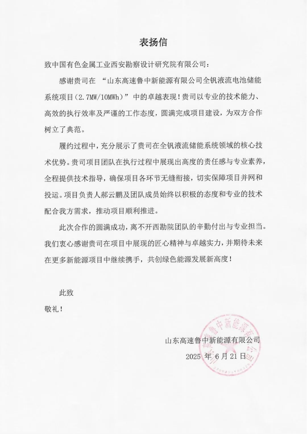 在客戶發(fā)來的表揚(yáng)信中,山東高速魯中新能源有限公司對(duì)公司專業(yè)技術(shù)能力、高效執(zhí)行力、嚴(yán)謹(jǐn)工作態(tài)度以及圓滿完成項(xiàng)目建設(shè)給予了高度贊揚(yáng)。信中特別指出,公司在全釩液流儲(chǔ)能系統(tǒng)領(lǐng)域展現(xiàn)了核心技術(shù)優(yōu)勢(shì),項(xiàng)目負(fù)責(zé)人郝云鵬及其團(tuán)隊(duì)成員以高度的責(zé)任感和專業(yè)素養(yǎng),全程提供可靠技術(shù)指導(dǎo),確保了項(xiàng)目各環(huán)節(jié)無縫銜接,有效保障了項(xiàng)目的順利并網(wǎng)和投運(yùn)??蛻羝诖磥砼c公司在更多新能源項(xiàng)目中深化合作,共同推動(dòng)綠色能源發(fā)展邁向新高度。