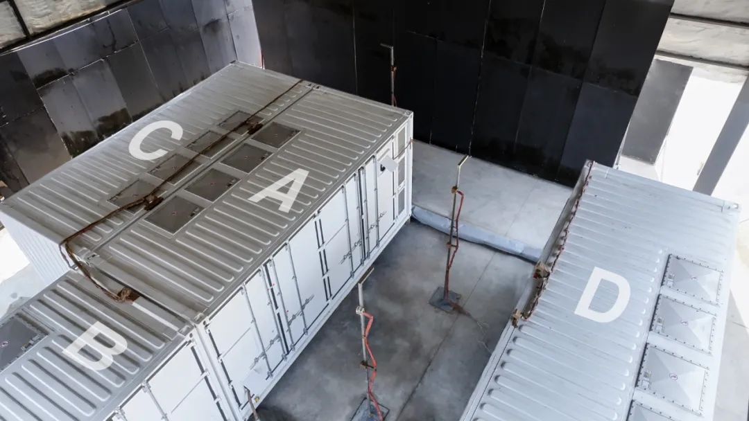 本次測(cè)試嚴(yán)格按照?qǐng)稣菊鎸?shí)場(chǎng)景設(shè)計(jì),ABCD箱4組遠(yuǎn)景智慧交易型儲(chǔ)能系統(tǒng),單箱容量5MWh,現(xiàn)場(chǎng)充電至100%SOC,物理屏蔽消防系統(tǒng),燃燒全過(guò)程0干預(yù)。