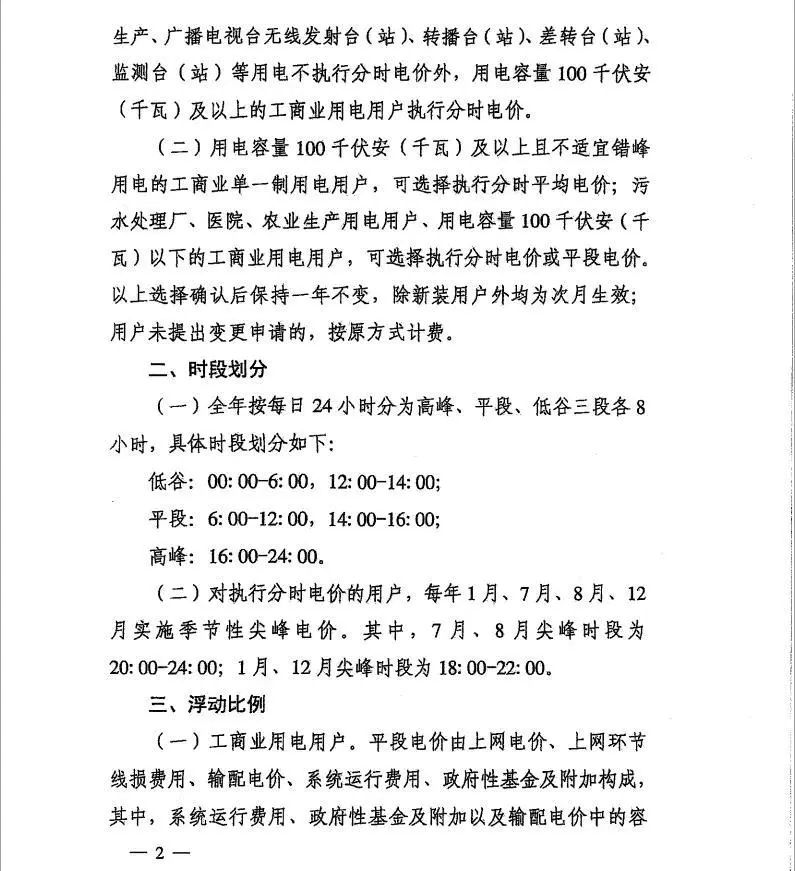 3)污水處理廠、醫(yī)院、農(nóng)業(yè)生產(chǎn)用電用戶、用電容量100千伏安(千 瓦)以下的工商業(yè)用電用戶,可選擇執(zhí)行分時(shí)電價(jià)或平段電價(jià)。